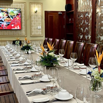 Nhà hàng có 4 phòng VIP dành cho nhóm từ 10 đến 12 người hoặc nhóm tối đa 24 người. Bàn ghế được bố trí phục vụ các món ăn Á - Âu cho khoảng 120 đến 150 người.